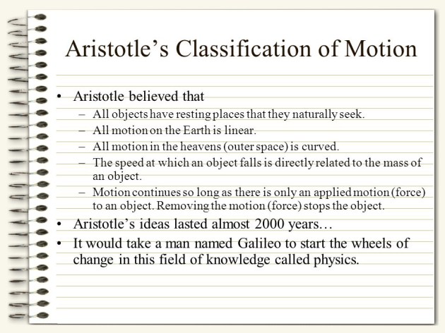 “Objects in the heavens (the celestial sphere) move in circular motion, without any external force compelling them to do so. Objects on Earth (the terrestrial sphere) move in straight lines unless forced to move in a curve.