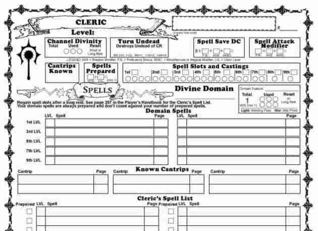 8.    The biggest change is on Page 4. This page will be different for each Class. It will calculate Spell Slots, Cantrips Known, Spells Prepared, Spell Save DC, Spell Attack Modifier and other things for other classes. I am no longer trying to provide room for spell descriptions. These are best handled with spell cards, or in some cases a printed spell book (refer to my posts HERE and HERE.) I have tried to leave enough room for more than just the spell name. What I would do is enter a symbol to indicate if the spell is (C) concentration, (R) ritual, or sometimes (T) casting time. There is also room to indicate which book the spell is found in if it isn’t from the PHB. For the Cleric and some others, when you get to higher levels there may not be enough room to list all available spells, but there should be enough room to list all of the spells you might want to use. Please let me know if this becomes a problem.