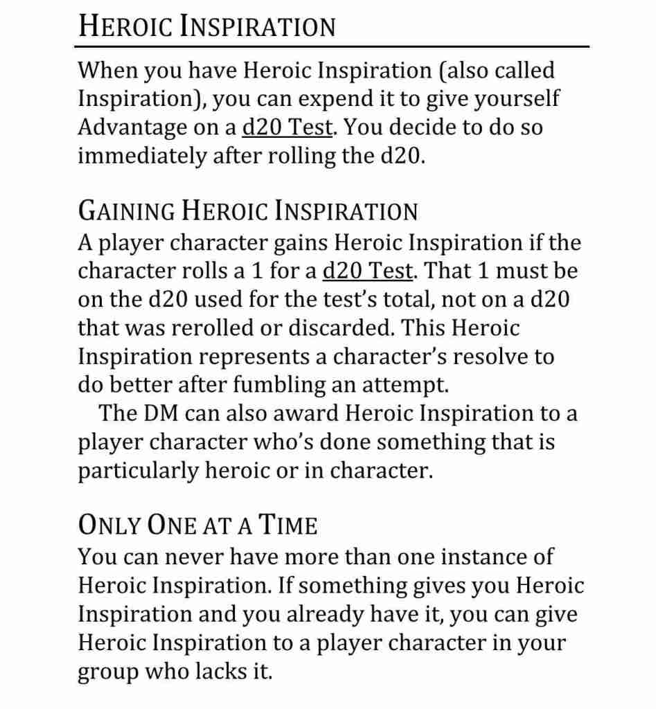 4) They previously had you getting inspiration when you rolled a 20 for a d20 Test. I liked that. They changed it to rolling a 1 instead. This is the one I have a problem with. Here’s why I disagree with the way it is currently presented: