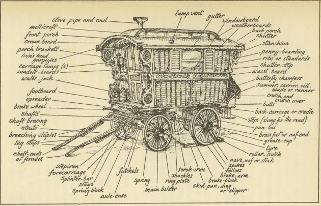 This large wagon is completely enclosed with wood walls and top that have been reinforced with metal plates and has shuttered arrow slits and a smokestack. It has 6 steel reinforced wheels on three axes. There is a door in the back, another in the front, and a trap door in the top. There are several small arrows sticking into the wagon at various places and at odd angles.