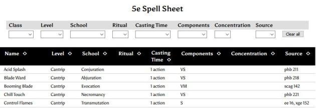 Class Feature Sheets: These are separate class feature sheets each of which contains one page for each sub-class for each of the classes in the Player’s Handbook. The information on these sheets is intended as a reminder of the major effects of each of the features. As such, the feature descriptions are abbreviated. Please refer to the Player’s Handbook for the full descriptions. One abbreviation I should explain – When it says (1/rest), that indicates that it can be used one time between a long or short rest. (1/long rest) is one per long rest.: Barbarian, Bard, Cleric, Druid, Fighter, Monk, Paladin, Ranger, Rogue, Sorcerer, Warlock, Wizard
