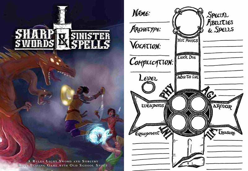 Sharp Swords & Sinister Spells is a rules light sword & sorcery role playing game with an old school spirit created by Diogo Nogueira and published by Old Skull Publishing. As you can see form the character sheet (above) the player has little to keep track of and it should be easy to learn. As is true for most OSR clones it has a lot more in common with early editions than it does with 5e. It was published under the Open Game License (OGL 1.0a).