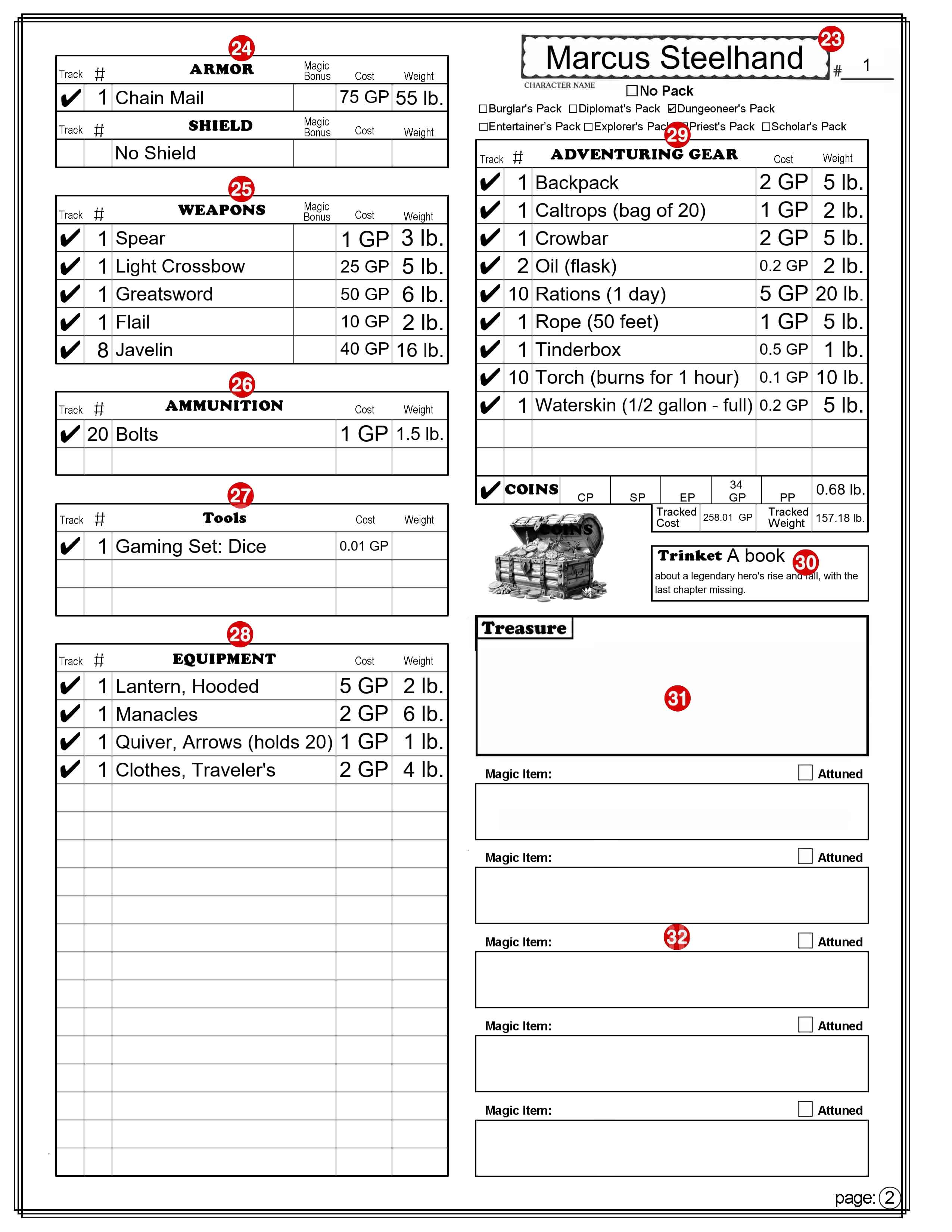 Refer to the BAM Core Rule Book for information regarding Gear Slots. All the Weapons, Armor, Tools, and other equipment listed in that book can be selected from drop-downs, or you can type any text you want into the boxes.