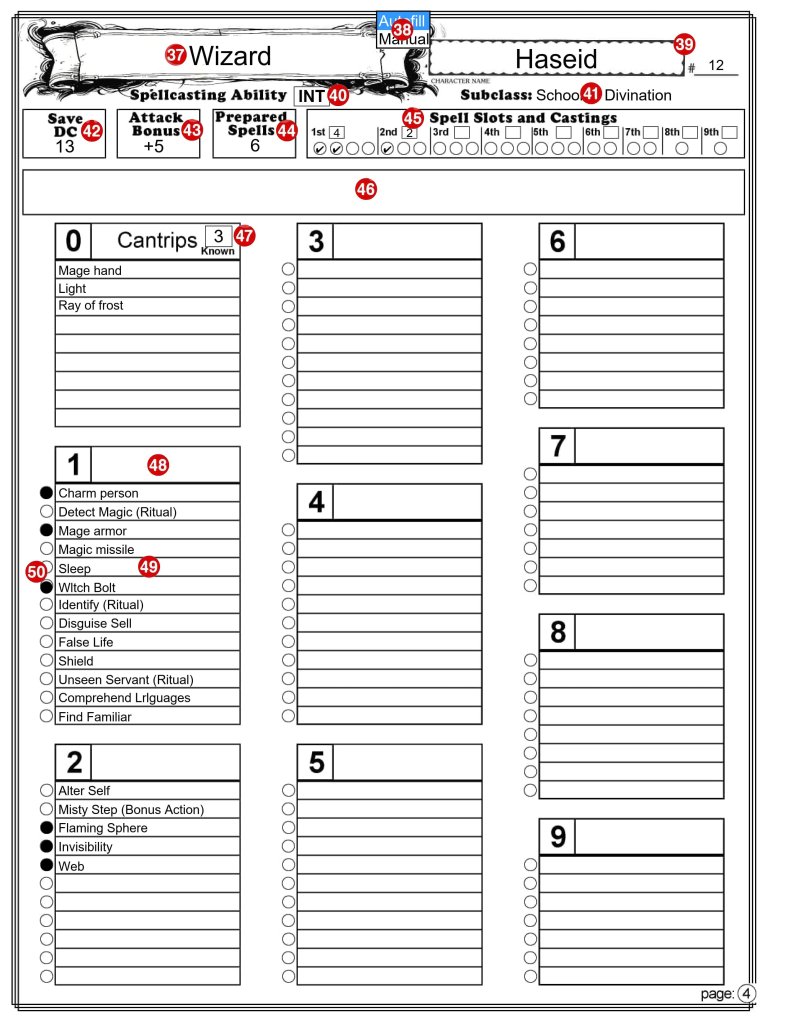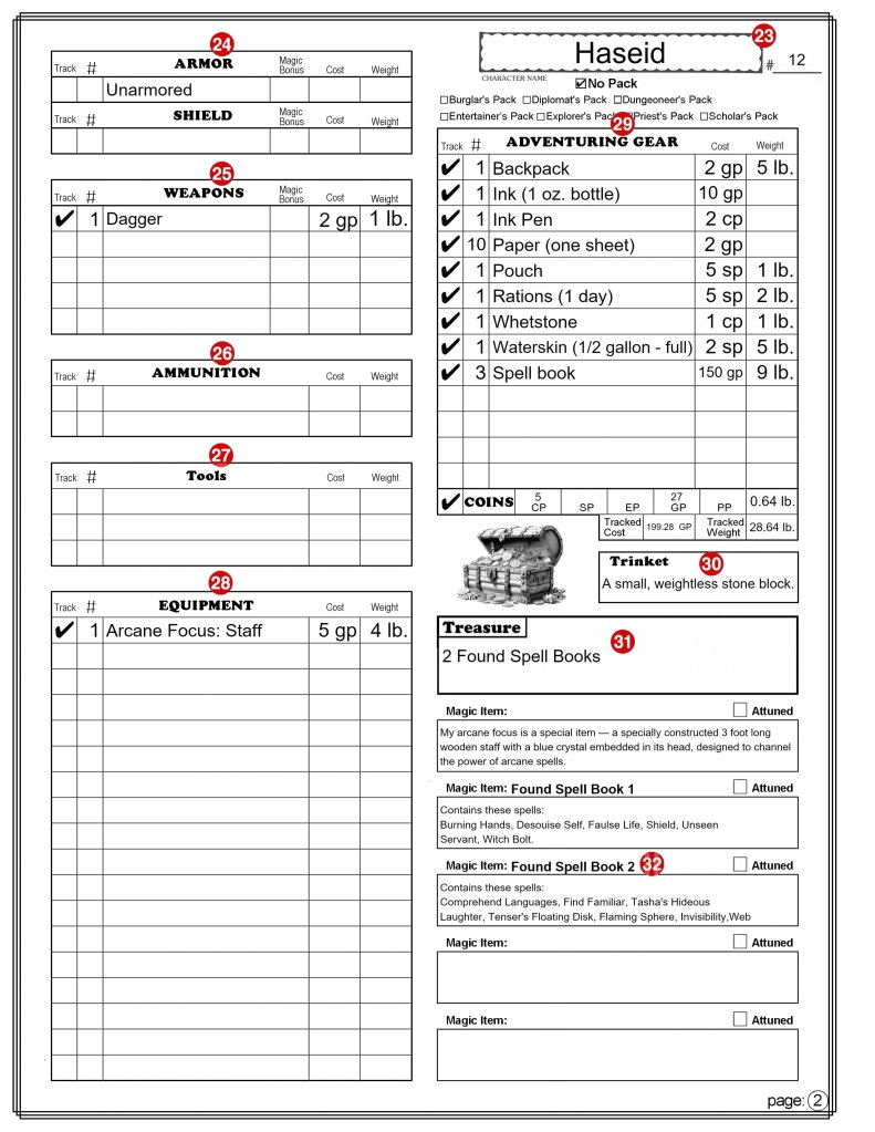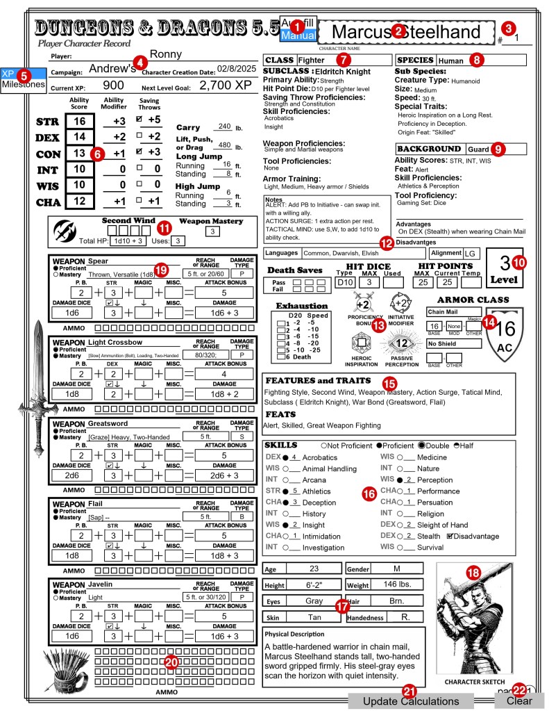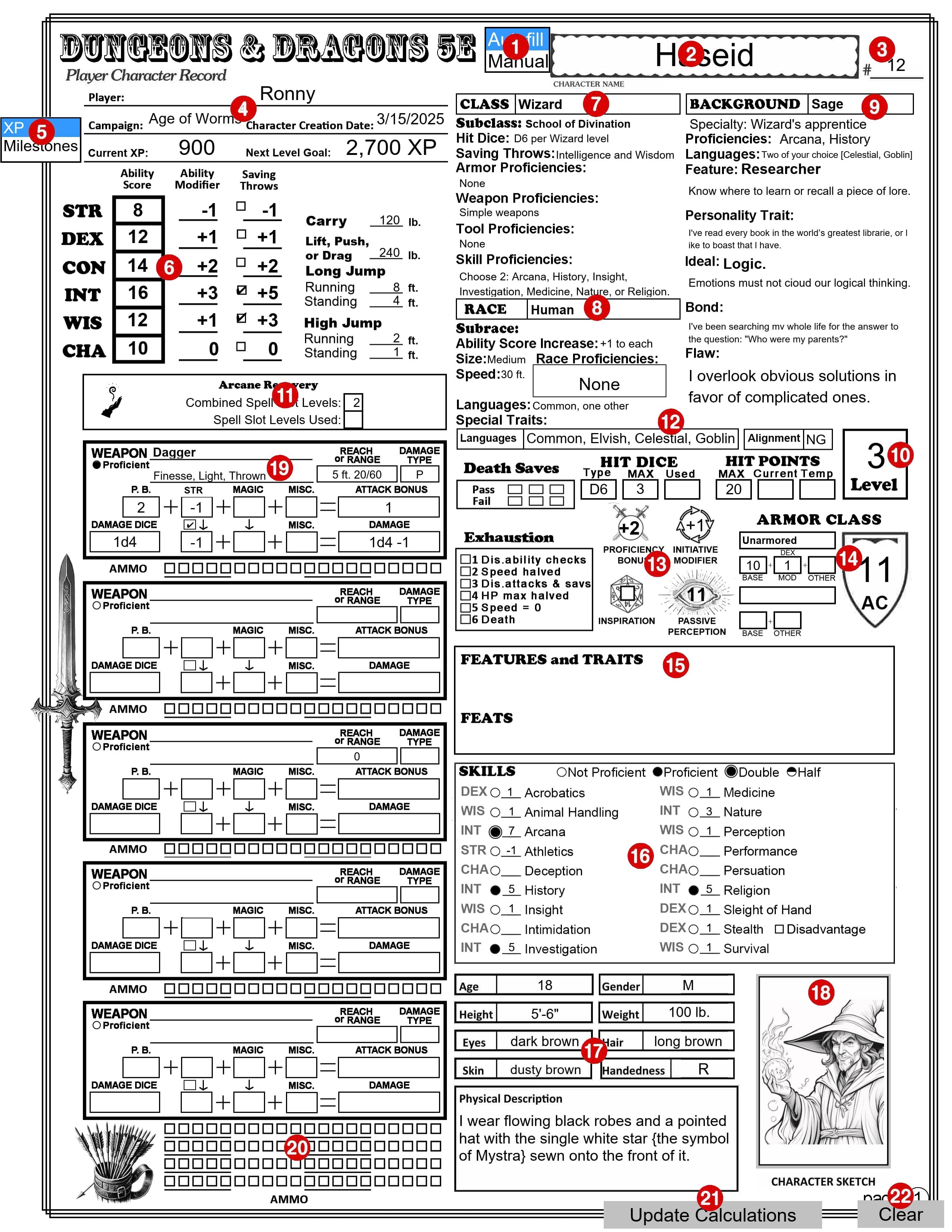 You will need to enter your ability modifiers and character level before the calculations for Weapons and Armor Class can be made. You can select Ancestry, Background, Class, Deity, and Weapons from drop-down lists, or enter any text in the box. For selected text, the features and other information below will fill in. For Ancestry, Background, Class, or Weapons text you typed in, you can enter any information below as you would like. To change the information below a selection you made, just change the name (adding a space behind the name will do). Clearing the text in the box, or making a different selection from the drop-down, will delete all the text below it.
