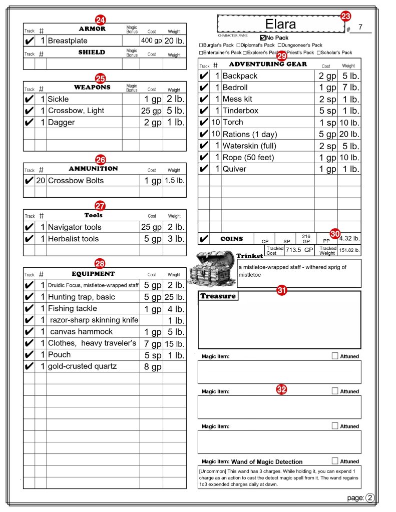 Note: There is no Autofill or Manual mode for this sheet, although the Adventuring Gear section (number 29) has a “No Pack” option that is similar to Manual mode that only applies to the Adventuring Gear section.