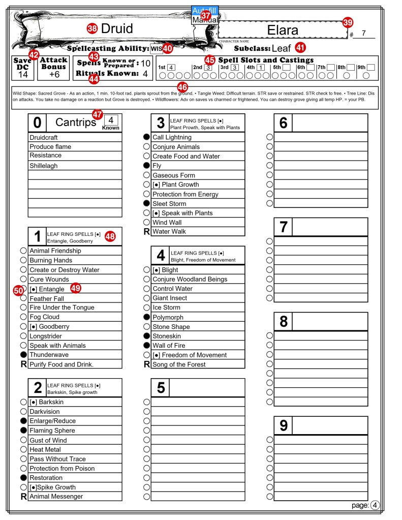 This incorporates the changes to D&D 5E found in ToV’s “Players Guide”. It is 4 pages, 2 sheets if printed on both sides. (Note that I will be referring to the set of all 4 pages in the singular, as the “character sheet”.) Page one has all of your character’s basic information and all you need for combat other than your spells. Page two is just for equipment and treasure. Page three is Character background and notes. Page four is for magic spells. It can be printed blank and filled out with a pencil, or you can fill in the forms on your device and most of the calculations will be done for you. It automatically calculates; ability and saving throw modifiers, carrying capacity and jump distances, Armor Class, Proficiency Bonus, Passive Perception, Skill check modifiers, Weapon attack bonus and damage, Equipment cost and weight, and more. It can fill in all the adventuring gear you get if you select an equipment pack (such as an “Explorer’s Pack”). In addition to that, it contains a new Autofill option that can fill in all the standard information based on your class, Lineage, Heritage, and Background.