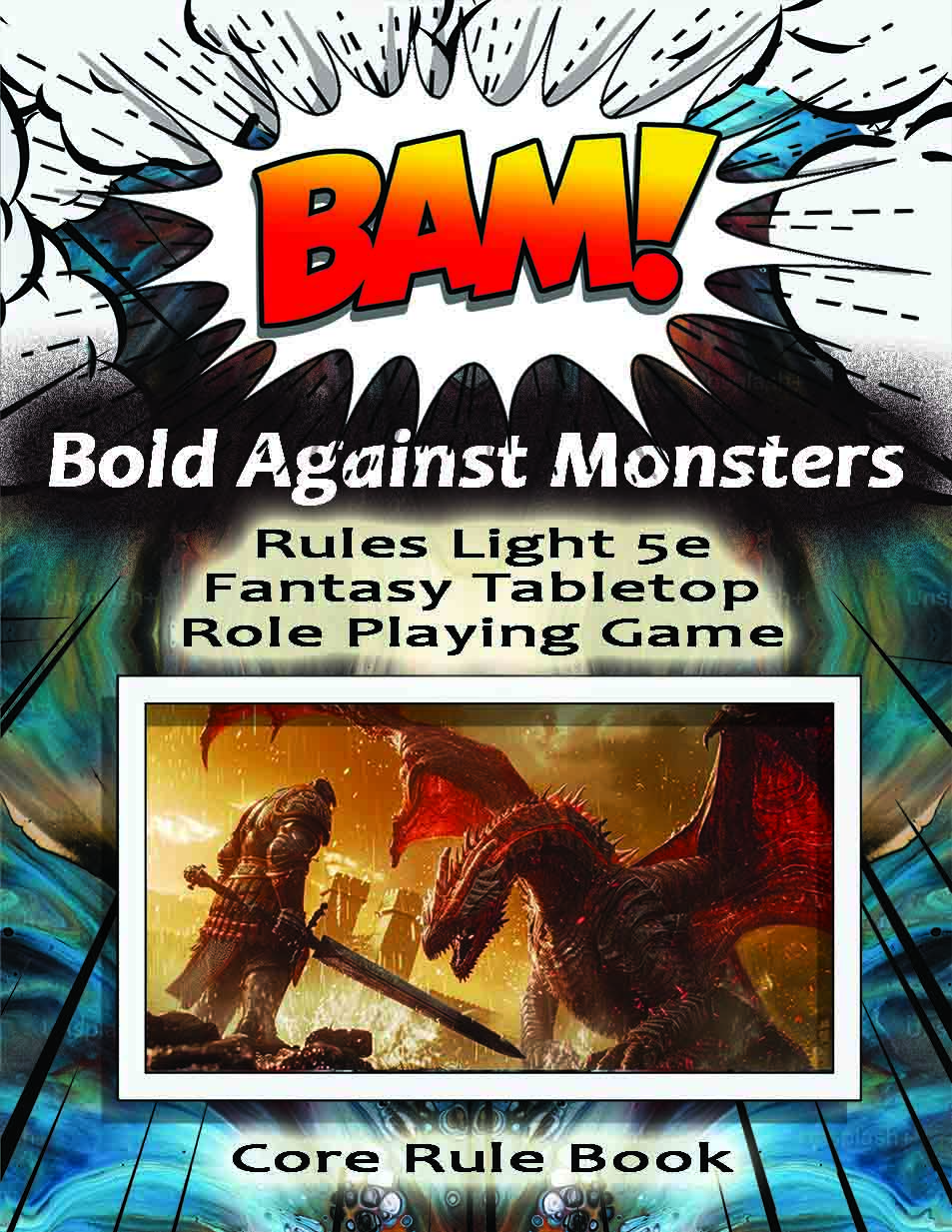 Bold against Monsters (or BAM) is a 5E compatible rules-light fantasy Role Playing Game (RPG). Everything needed to play or run a game is in this book. It is compatible with any published 5E adventure for characters up to level 10. It can serve as an introduction to 5E role playing for new players or anyone looking for a game with familiar characters you can easily create and quickly play. Character creation, level advancement, weapons, inventory tracking, proficiencies, spellcasting, combat, and more have been simplified.