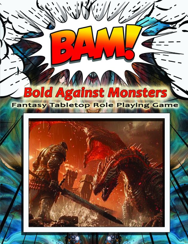 Let me introduce Bold Against Monsters. (You can call it BAM.). This is a new D&D 5E compatible rules-light Role Playing Game that I – the Old Dungeon Master – just finished writing.