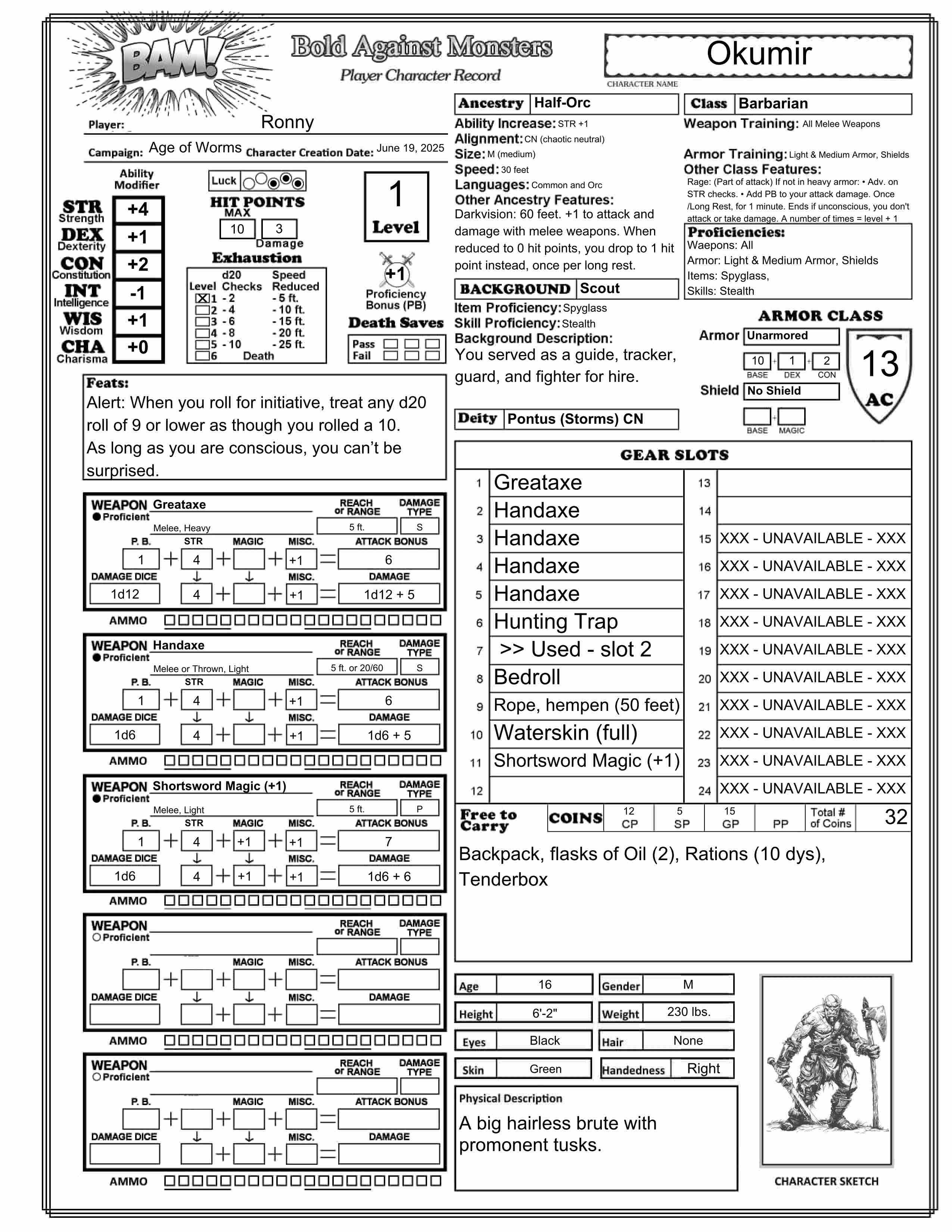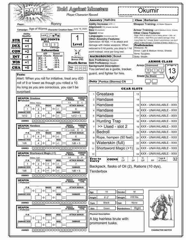 The BAM Core Rule Book includes a character sheet on the back cover, but I also created this form-fillable version.