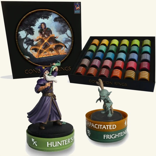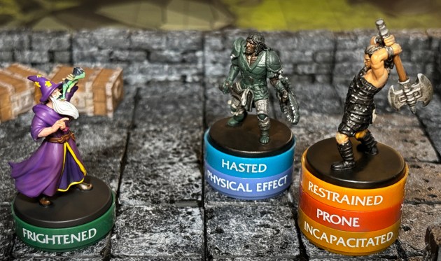 The Conditions There are 4 identical rings for each condition. Each set of 4 is a different color. There are rings for each of the D&D fifth edition conditions: Blinded, Charmed, Deafened, Exhaustion, Frightened, Grappled, Incapacitated, Invisible, Paralyzed, Petrified, Poisoned, Prone, Restrained, Stunned, and Unconscious. In addition to these standard conditions, it also includes: Aid, Bane, Banished, Blessed, Concentration, Fairy Fire, Hasted, Hexed, Hunter’s Mark, Madness, Polymorphed, Raging, Slowed, and two more for anything else you might be need labeled; Magical Effect, and Physical Effect. For a total of 120 pieces. The addition of the magical and other effects is a welcome inclusion.