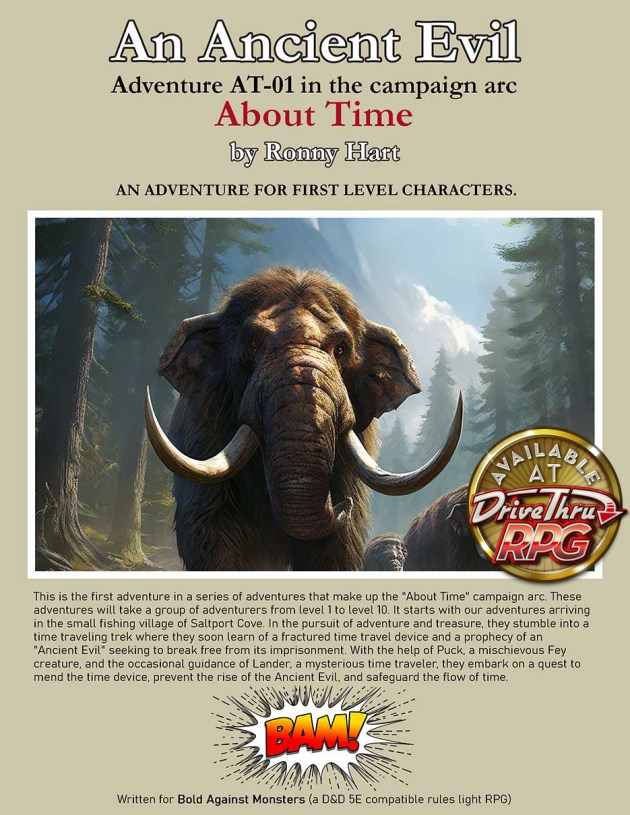 I introduced the It’s About Time Campaign arc here in May 2024 when I posted AT-01 An Ancient Evil. I haven’t finished writing these adventures. The last one I posted here was AT-08 The Pirate Queen’s Ploy in March this year. I still intend to finish these, but first I am re-writing them specifically for use with my new rules light 5E compatible RPG game rules Bold Against Monsters (BAM). I have just finished the first of these and it is now for sale on DriveThruRPG.